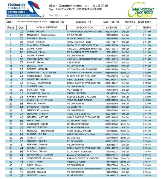 Mickaël Larpe (Girondins de Bordeaux Cyclisme) a remporté ce dimanche à Courdemanche le 17ème tour de communauté de communes de Lucé (1-2-3+J) organisé par Saint-Vincent Lucé Bercé Cycliste. Abderrahmane Mansouri (VC de Tours) et Ronan Racault (Guidon Chalettois) complètent le podium. Mickael Larpe remporte également le classement par points (lire ici), Abderrhamane Mansouri est 2ème et meilleur jeune (lire ici) tandis que Florian Deriaux remporte le classement du meilleur grimpeur (lire ici). Gérard Torres (VC Châteauneuf-sur-Sarthe) est 12ème et 1er 2ème catégorie, Alexis Delestre (VC Conlie) est 15ème et 1er junior tandis que son père Stéphane Delestre (VC Conlie) est 21ème et 1er 3ème catégorie.