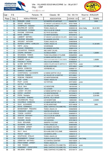 Déjà victorieux la veille à Château-du-Loir, Louis Roquain (UC Nantes Atlantique) a remporté ce samedi l'épreuve 2-3+J de Villaines-sous-Malicorne organisé par le CS Fléchois. Il devance le 3ème catégorie de Saint-Vincent Lucé-Bercé-Cycliste Mickaël Diguet et l'Orléanais Sébastien Champalou. Mathieu Lambert (SVLBC), cadet surclassé est 8ème et Romain Mousseau (Team Chalonnes Cyclisme) est 16ème et 1er junior.