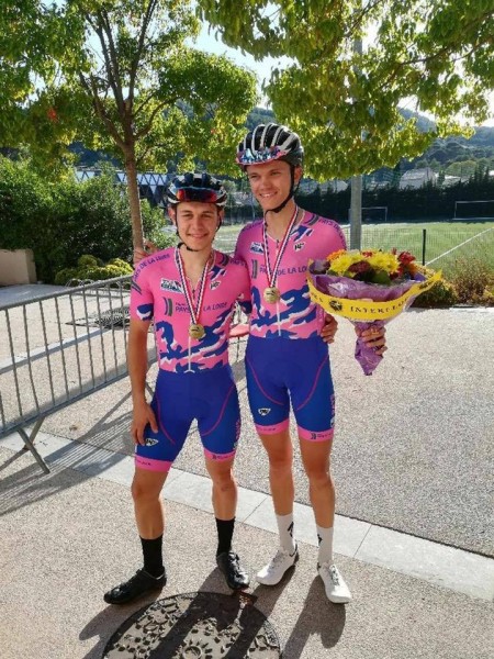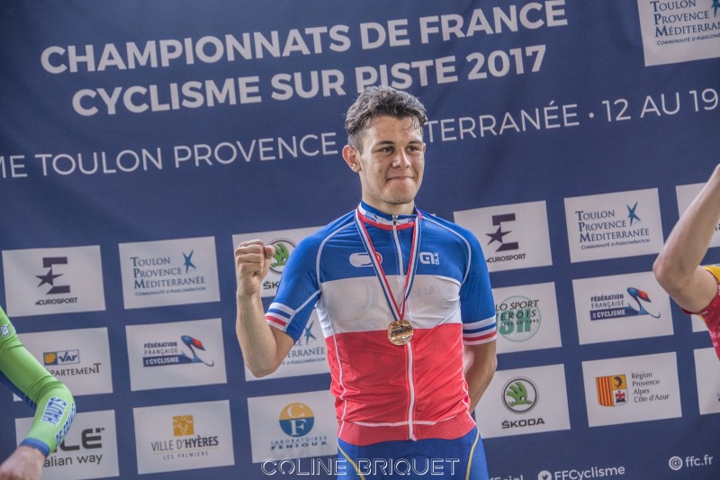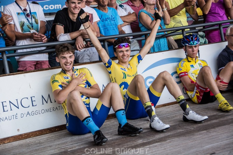 Samuel Thibaud champion de France de la course scratch, félicité par ses coéquipiers