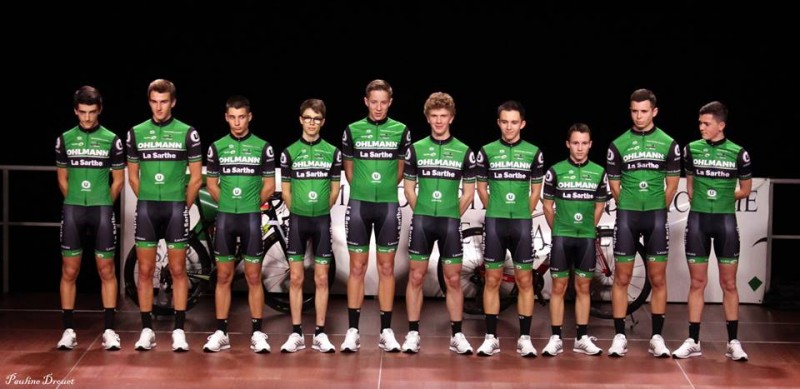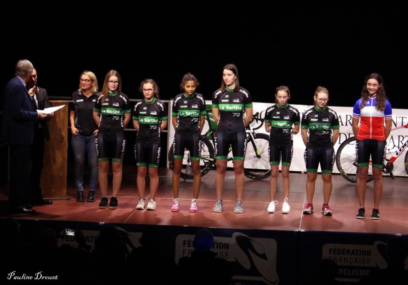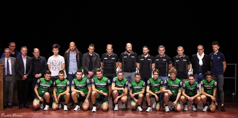 Les juniors du Team accompagnés par les sponsors Serge Ohlmann, Stéphane Le Maréchal (Super U Arnage), les vélocistes Christophe Paulvé (Mondovélo Le Mans Sud) et Sébastien Héron (NS Bike), les parrains Axel Macé et Quentin Bertrand, les éducateurs Stéphane Guay (CTD), Gaétan Biard, Laurent Seyeux, Alexandre Chantoiseau, Marck Breton, Bertrand Vitour et les présidents du comité départemental Jean-Claude Esnault et du comité régional Marc Tilly