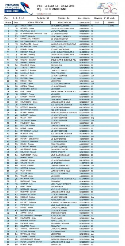 Killian Théot (CM Aubervilliers) a remporté ce lundi le GP des Fêtes Pascales du Luart, épreuve toute catégorie organisée par l'EC Changéenne. Au terme d'une échappée de 13 coureurs, le Normand a devancé au sprint Arthur Goumont (UC Cholet 49) et David Boutville (Laval Cyclisme 53). Guy Le Monnier de Gouville (CG Orléans) est 4ème et 1er 2ème catégorie, Florian François (CS Fléchois) est 16ème et 1er 3ème catégorie, Théo Leroux est 20ème et 1er junior et Julien Mulot (UC Montgesnoise) est 36ème et 1er pass'cyclisme.
