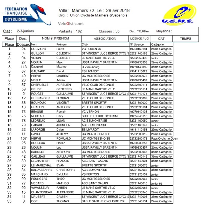Le Normand Pierre Couvigny (VC Rouen 76) a remporté ce dimanche à Mamers le souvenir Jean Plaudet, support du championnat de la Sarthe des 2èmes, 3èmes catégories et juniors. Célestin Guillon (Saint-Vincent Lucé Bercé Cyclliste) est 2ème et champion de la Sarthe des 2èmes catégorie et Clément Voisin complète le podium et conserve son titre de champion de la Sarthe juniors. Laurent Hervé (UC Montgesnoise) est 7ème et champion de la Sarthe des 3èmes catégories.