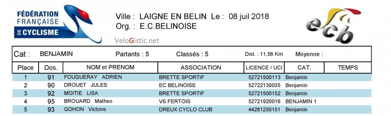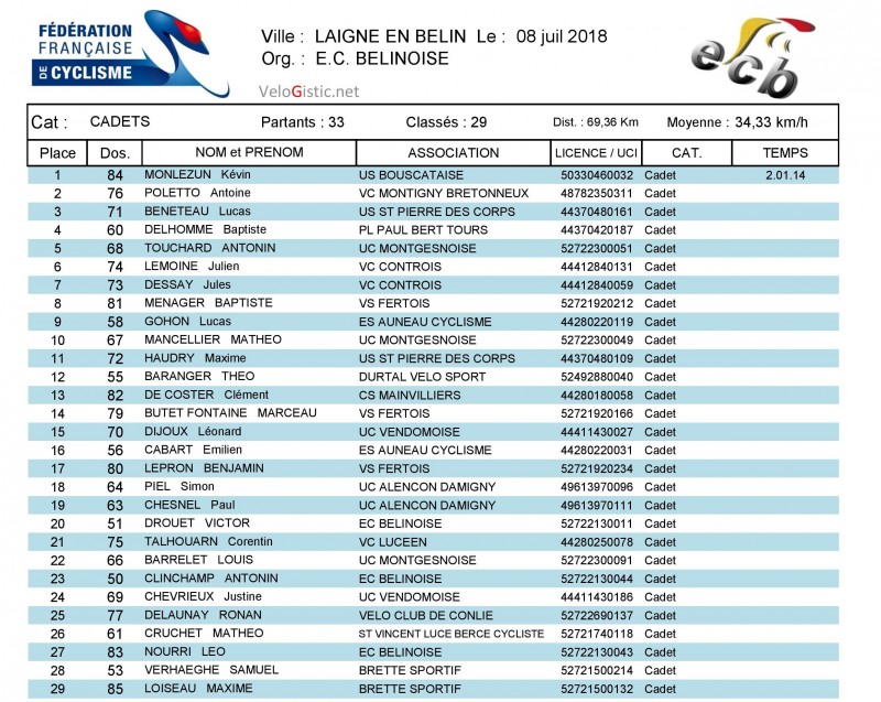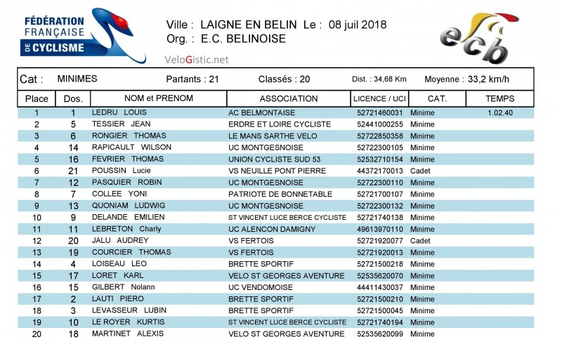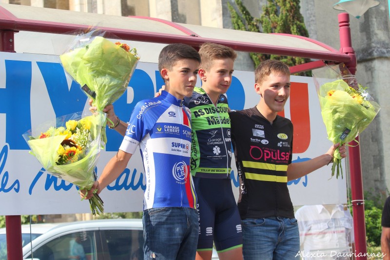 Chez les minimes, le Belmontais a devancé au sprint Jean Tessier (Erdre et Loire Cycliste) et Thomas Rongier (Le Mans Sarthe Vélo). Lucie Poussin (VS Neuillé Pont Pierre) est 5ème et 1ère dame.