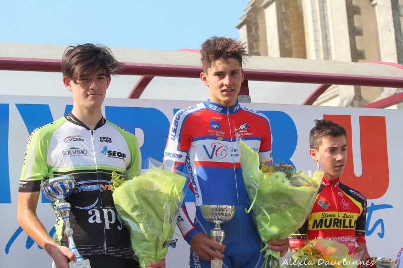 Chez les cadets, l'Aquitain vainqueur de la 1ère manche du Trophée Madiot a devancé au sprint le francilien Antoine Poletto (VC Montigny-le-Bretonneux) et Lucas Beneteau (US St-Pierre des Corps).