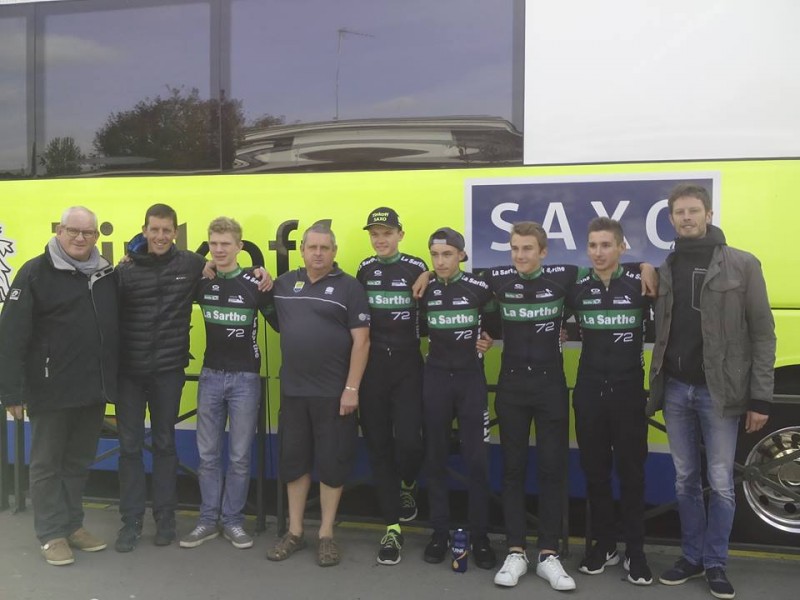 Le groupe Sarthe pose devant le bus de l'équipe Tinkoff-Saxo