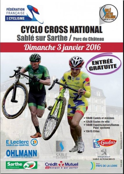 Voici l'affiche du premier grand rendez-vous cycliste de l'année 2016, le traditionnel cyclo-cross national de Sablé-sur-Sarthe organisé par Sablé Sarthe Cyclisme PdL. Il se déroulera le dimanche 3 janvier soit une semaine avant les championnats de France de Besançon (Franche-Comté), les 9 et 10 janvier.