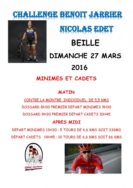 Ce challenge est organisé par l’Union Cycliste Montgesnoise sous le parrainage des coureurs professionnels Benoît Jarrier (Fortuneo - Vital Concept) et Nicolas Edet (Cofidis). Il est ouvert aux minimes et cadets (+dames) et est composé des 4 épreuves suivantes :