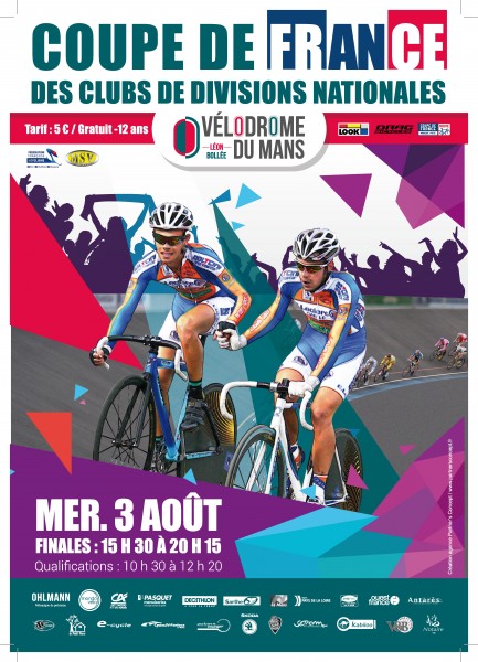 Voici l'affiche officielle de la manche de la Coupe de France des clubs de Divisions Nationales qui se déroulera sur le vélodrome Léon-Bollée du Mans le mercredi 3 août 2016.