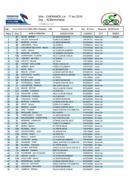 Jérémy David (UC Montgesnoise) a remporté ce dimanche à Chérancé l'épreuve 3+J, support du champion de la Sarthe des 3èmes catégories et des juniors, organisée par l'AC Belmontaise. Il remporte ainsi le titre de champion chez les 3èmes catégories. Son coéquipier Dylan Moreira, 3ème et Vincent Besnard, 7ème (UC Mamers S) complètent le podium sarthois des 3ème catégories. Florian Guéranger (VC Conlie) enlève le titre chez les juniors. Axel Macé (AC Belmontaise), 13ème et Simon Sourisseau (Le Mans Sarthe Vélo), 18ème complètent le podium sarthois des juniors. Enfin, l'Ornais Emmanuel Salles (Flers Cyclisme 61) 2ème complète le podium de la course.
