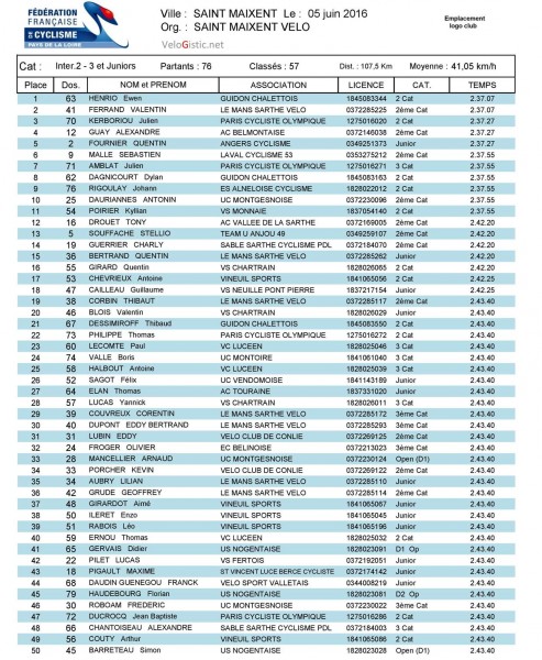 Ewen Henrio (Guidon Chelettois) a remporté ce dimanche l'épreuve 2-3+J organisé à Saint-Maixent par Saint-Maixent Vélo. Il devance Valentin Ferrand (Le Mans Sarthe Vélo) et Julien Kerboriou (Paris CO). Quentin Fournier (Angers Cyclisme) est 5ème et 1er junior et Julien Amblat (Paris CO) est 7ème et 1er 3ème catégorie.