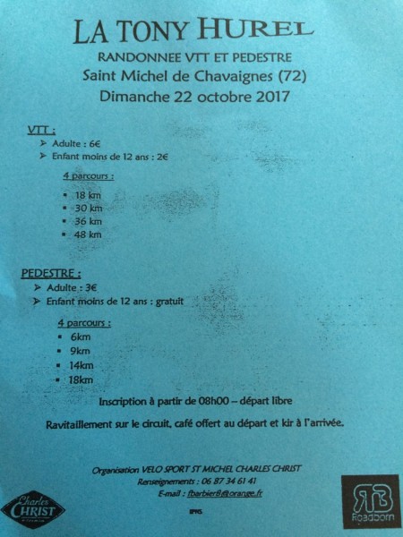 - Saint-Michel-de-Chavaignes (VSSMC) : la Tony Hurel, randonnée VTT et pédestre, détails ici