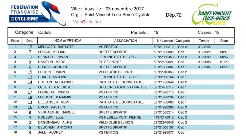 Chez les cadets, le duel attendu a tourné en faveur de Baptiste Ménager (VS Fertois) qui remporte le titre devant Killian Loison (Brette Sportif), le polyvalent Erwan Besnier (Le Mans Sarthe Vélo) complète le podium. Bénédicte Ollier (Brûlon VTT Loisirs Nature) est 9ème et championne de la Sarthe cadette.