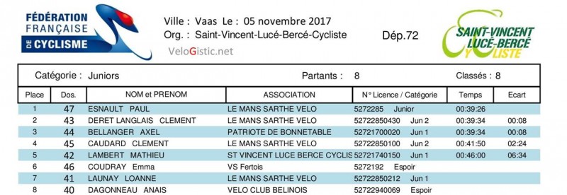 Chez les juniors, doublé du Mans Sarthe Vélo, Paul Esnault remporte le titre de champion de la Sarthe devant Clément Deret-Langlais, Alexandre Bellanger prend la 3ème place. Emma Coudray (VS Fertois) est 6ème et championne de la Sarthe dame.