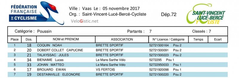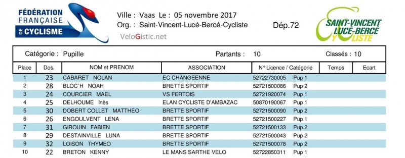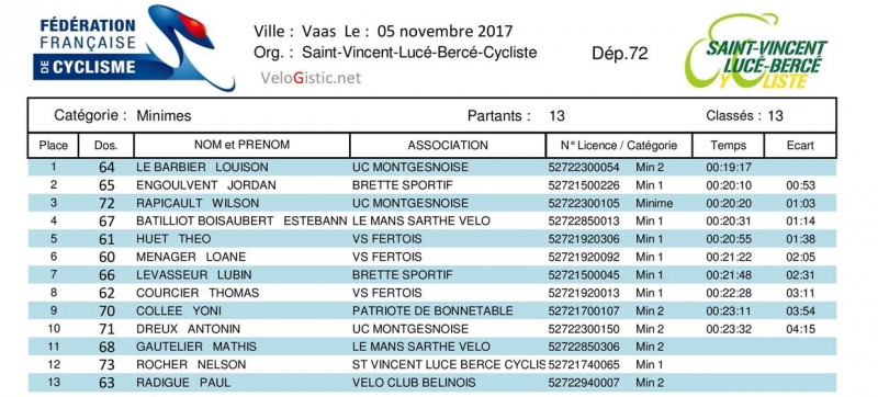 Chez les minimes, Louison La Barbier (UC Montgesnoise) est champion de la Sarthe devant Jordan Engoulvent (Brette Sportif) et son coéquipier Wilson Rapicault, Loanne Ménager (VS Fertois) est 6ème et championne de la Sarthe.
