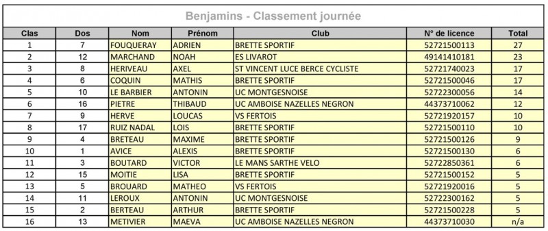 Chez les benjamins le Brettois qui a remporté les deux épreuves devance Noah Marchand (ES Livarot) et Axel Hériveau (Saint-Vincent LBC). Lisa Moitié (BS) est 12ème et 1ère benjamine.