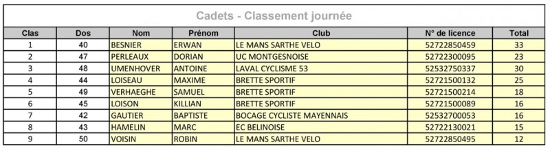 Chez les cadets, le manceau devance au classement général Dorian Perleaux (UC Montgesnoise) et Antoine Umenhover (Laval Cyclisme 53)