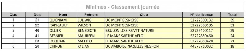 Chez les minimes, le Montgesnois qui a également remporté les deux épreuves devance son co-équipier Wilson Rapicault et la cadette championne de France Bénédicte Ollier (Brûlon Loisirs VTT Nature).