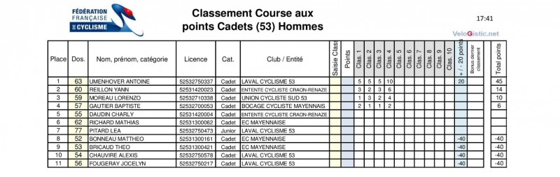 - Cadets : Antoine Umenhover (Laval Cyclisme 53) - course aux points et poursuite