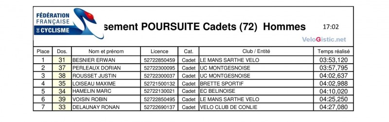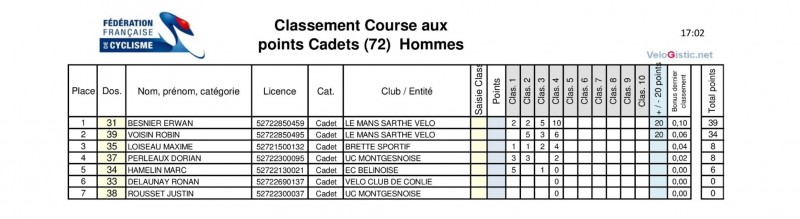 - Cadets : Erwan Besnier (Le Mans SV) - course aux points et poursuite