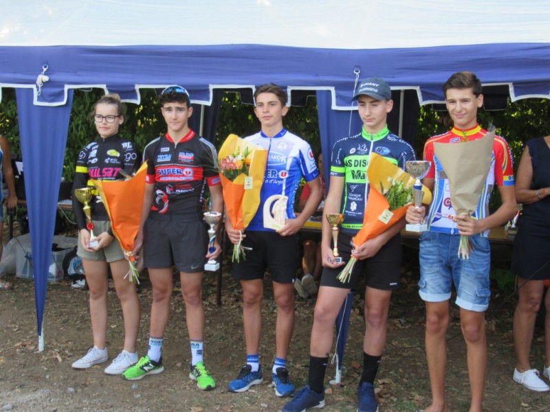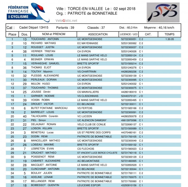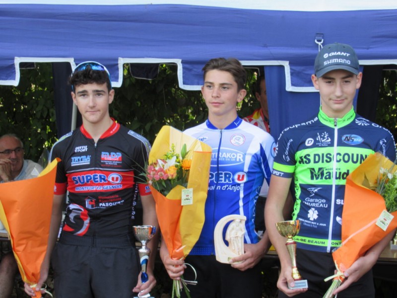 Chez les cadets, le Montgesnois a devancé Mathias Richard (EC Mayennaise), son co-équipier Justin Rousset. Tristan Verrier (CA Evron) est 4ème et 1er 1ère année et la junior Sarthoise du VS Clissonnais Noémie Garnier est Maureen Besnier (Le Mans Sarthe Vélo) est 15ème et 1ère dame.