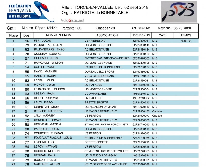 Chez les minimes, le champion régional Angevin sur route a devancé les Sarthois Aurélien Plessis (UC Montgesnoise), également 1er 1ère année et Théo Baldassarre (AC Belmontaise). Maureen Besnier (Le Mans Sarthe Vélo) est 17ème et 1ère dame.