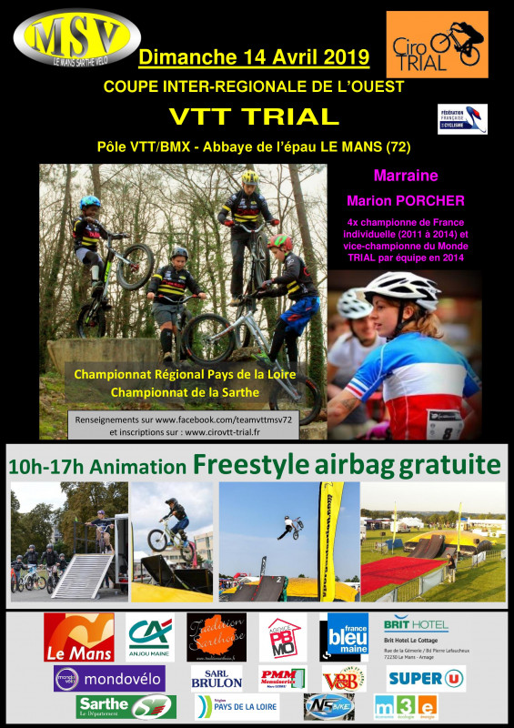 Le Mans Sarthe Vélo organise le dimanche 14 avril la 1ère manche de la Coupe Inter-Régionale de l'Ouest de VTT Trial. L'épreuve parrainé par l'ex-championne de France Marion Porcher servira de suppport aux championnats régional des Pays-de-la-Loire et de la Sarthe de la discipline.