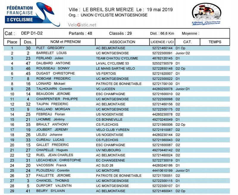 En D1-D2, c'est Louis Barrelet le combatif de la course, coureur junior du club organisateur, mais un vainqueur plus expérimenté en la personne de Grégory Plet (AC Belmontaise). Il devance le coureur du jour Louis Barrelet (UC Montgesnoise) second mais premier D2. A quelques encablures, Julien Ferland (Team Chatou Cyclisme) troisième complète le podium.