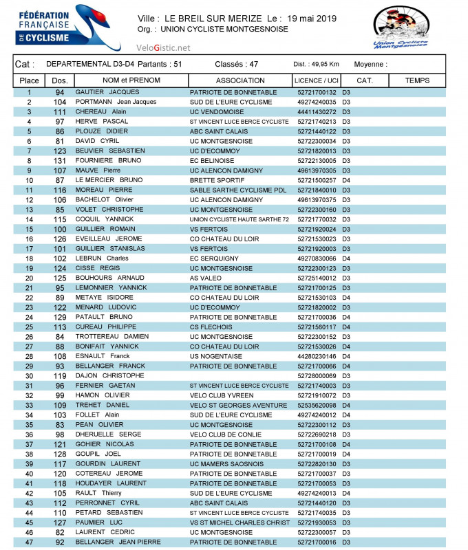 Jacques Gautier (Patriote de Bonnétable) a remporté la course D3-D4. Il a devancé au sprint son dernier compagnon d'échappée Jean-Jacques Portmann (Sud de l'Eure Cyclisme). Alain Chéreau (UC Vendômoise) termine à la troisième place. En finissant dixième Bruno Le Mercier (Brette Sportif) est le premier D4.
