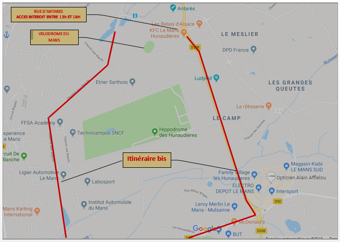 Attention ! En raison du match de football de ligue 2 Le Mans FC- RC Lens, les conditions d'accès au vélodrome seront difficiles samedi entre 13h et 18h. La rue d'Antarès, située entre le rond point d'Antarés et le Stade MMArena, sera fermée à la circulation. Les coureurs pourront toujours accéder au vélodrome en empruntant le chemin de l'étrier Sarthois par contre les spectateurs auront l'obligation de prendre la direction du chemin aux boeufs via le technoparc pour retrouver l'entrée qui leur est réservée. Ci-dessous, un plan d'accès.