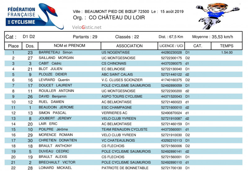En D1-D2, la bataille a fait rage dès les premiers tours de roues. C'est une petite douzaine d'unités qui va se disputer la victoire. Le sociétaire de l'U Nogentaise Simon Barreteau se montre le plus véloce dans ce final en montée. Il devance Morgan Sailland (UC Montgesnoise) second et premier D2. Cédric Cabit (CS Chinonais) termine à la troisième place.