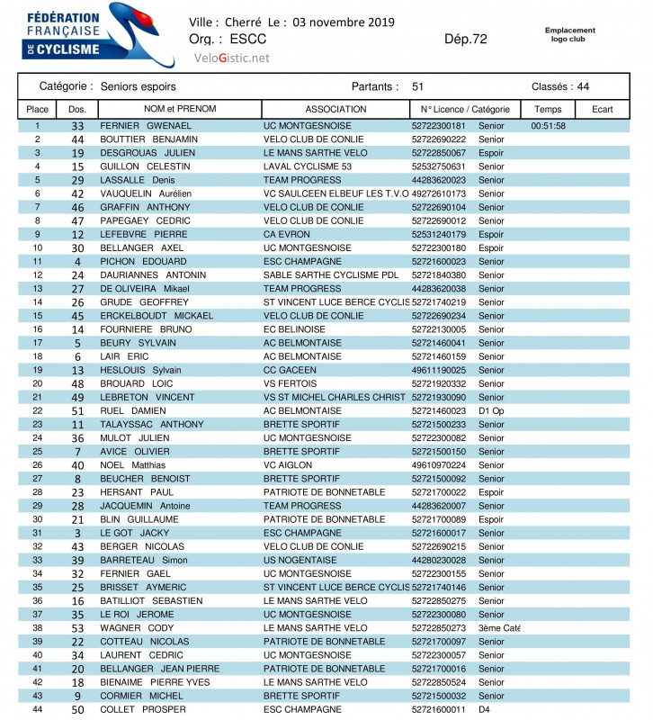 Gwénaël Fernier (UC Montgesnoise) a remporté ce dimanche le cyclo-cross souvenir Olivier Brouard de Cherré organisé par l'ESC Champagné. Benjamin Bouttier (VC Conlie) et l'espoir Julien Desgrouas (Le Mans Sarthe Vélo) complètent le podium.