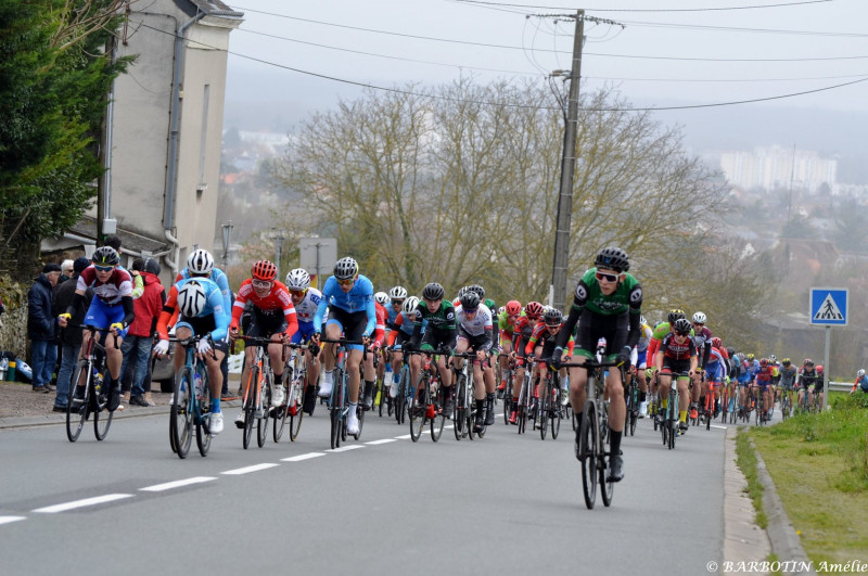 A deux tour de l’arrivée, 4 coureurs étaient échappés avec une trentaine de secondes d’avance sur un peloton très amoindri d’une quarantaine de coureurs dont 4 Sarthois (Louis, Erwan, Hugo et Justin)