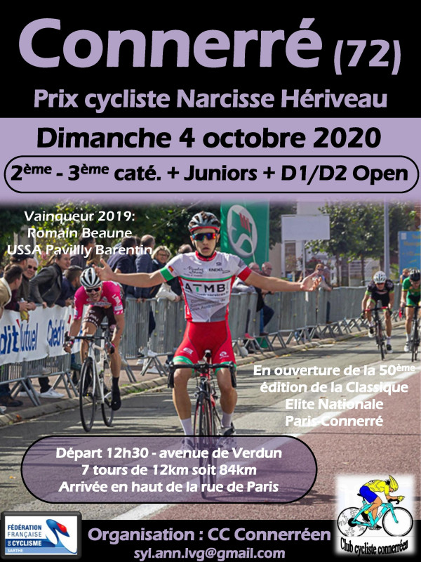 - Connerré (CCC) : Prix Narcisse Hériveau, 2-3+J, 7 tours de 12km soit 84km, 109 engagés, départ 12h30