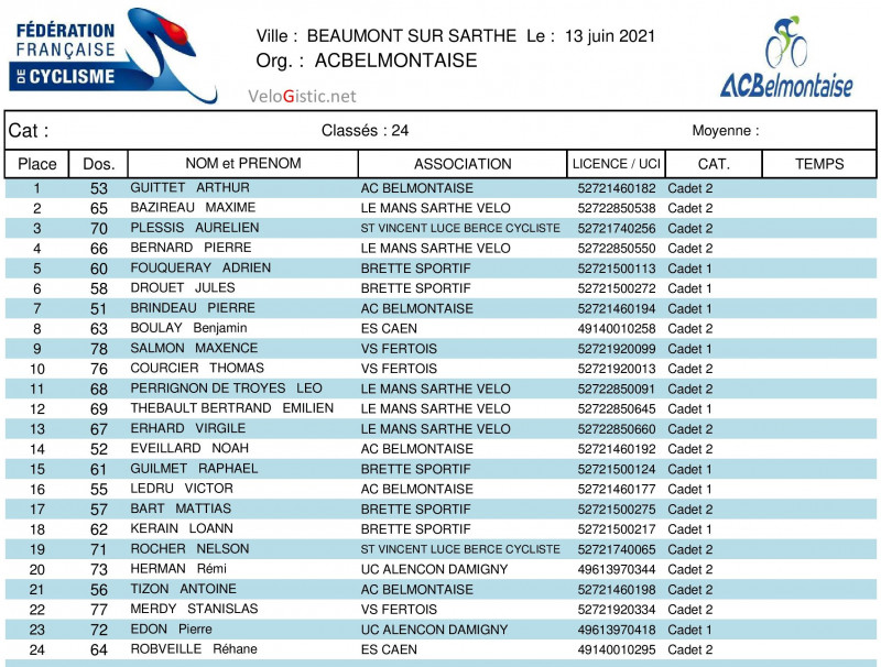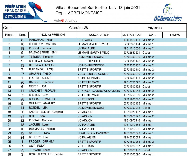 Beaumont-sur-Sarthe - minimes-cadets - dimanche 13 juin - victoires d'Arthur Guittet (AC Belmontaise) et Noah Marchand (ES Livarot)