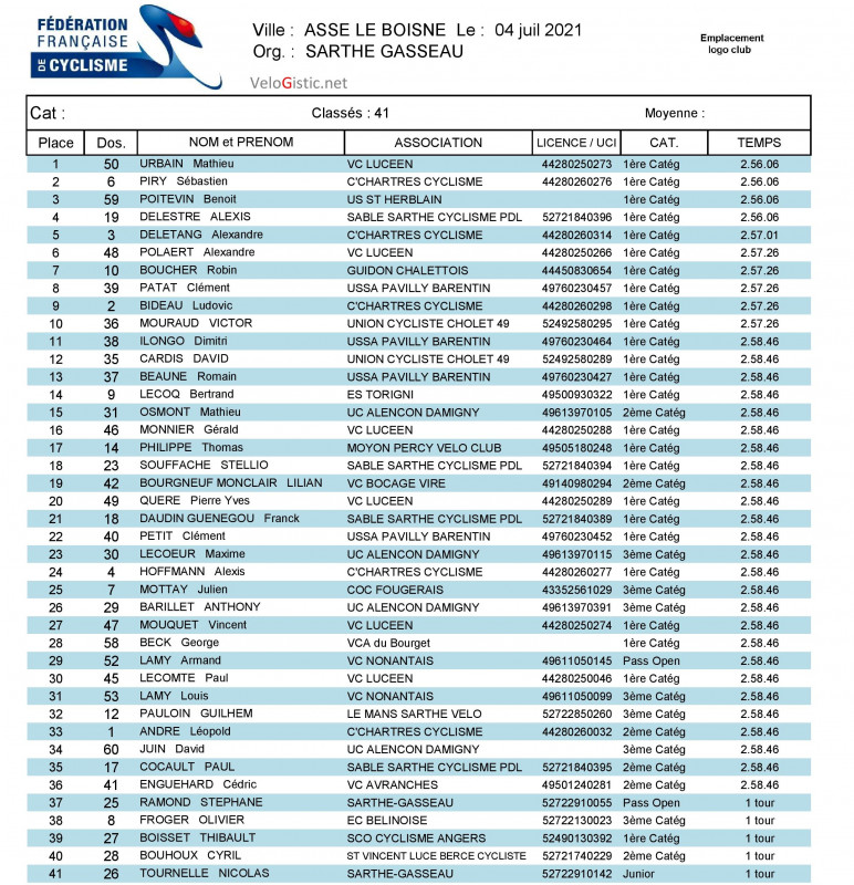 Mathieu Urbain (VC Lucéen) a remporté ce dimanche l'épreuve toutes catégories d'Assé-le-Boisne organisée par Sarthe Gasseau. Sébastien Piry (C'Chartres Cyclisme) et Benoit Poitevin (US St-Herblain) complètent le podium.