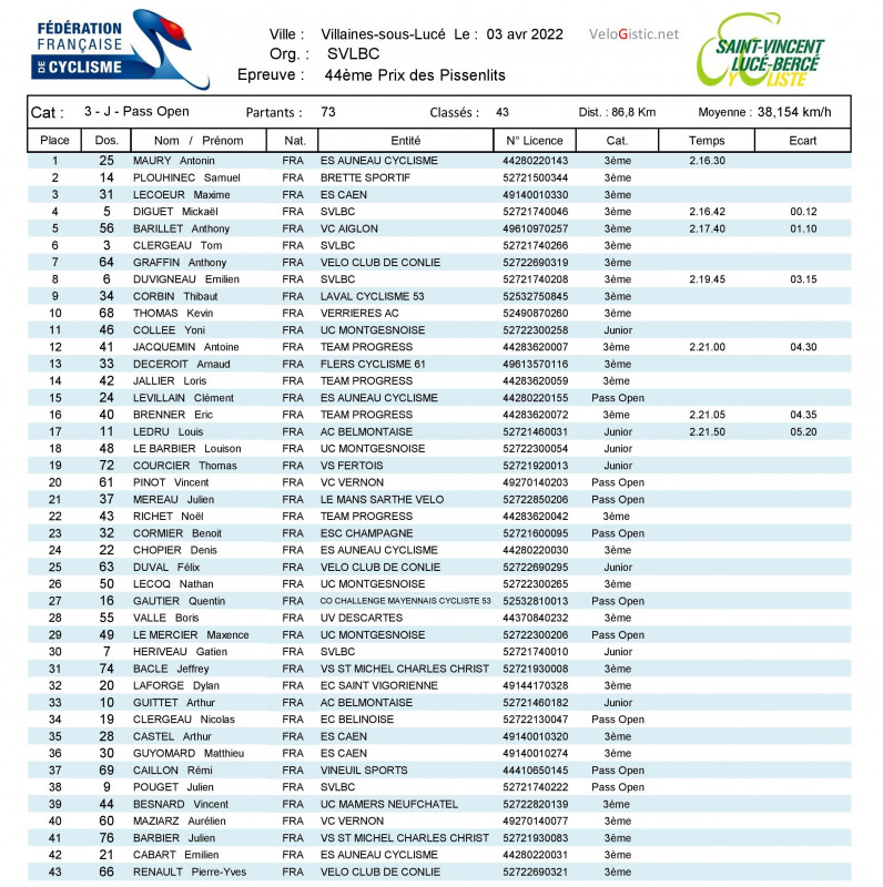 Antonin Maury (ES Auneau) a remporté ce dimanche à Villaines-sous-Lucé le 44ème Prix des Pissenlits (3+J) organisé par St-Vincent LBC. Samuel Plouhinec (Brette Sportif) et Maxime Lecoeur (ES Caen) complètent le podium.