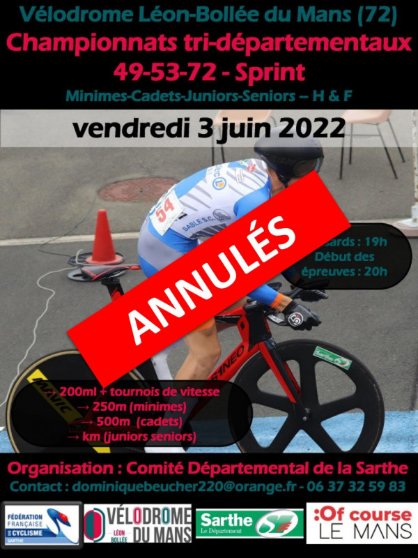 En accord avec les comités départementaux du Maine-et-Loire et de la Mayenne, faute d'un nombre d'engagés suffisants, le comité départemental annonce l'annulation des championnats tri-départementaux sur piste de sprint prévus ce vendredi soir sur le vélodrome Léon-Bollée du Mans. Les épreuves d'endurance prévus samedi après-midi à Laval sont également annulées.