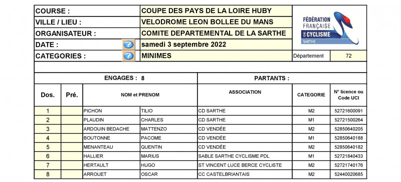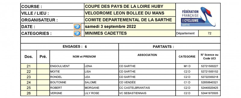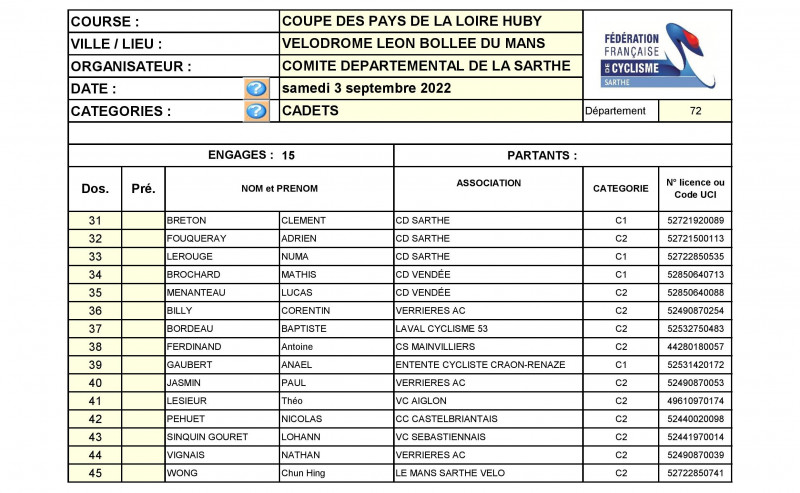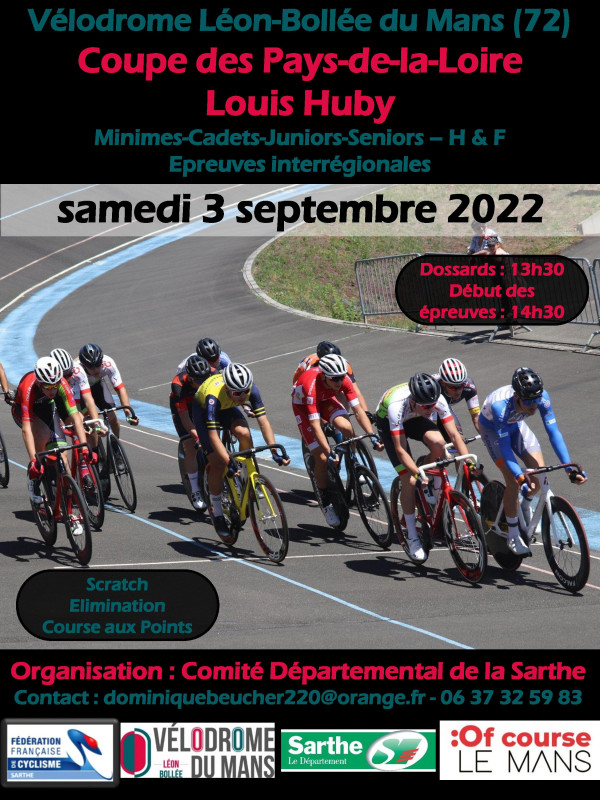 Le comité départemental organise ce samedi après-midi sur le vélodrome Léon-Bollée du Mans la finale de la Coupe des Pays-de-la-Loire sur piste Louis Huby. Au programme Scratch, Elimination et Course aux Points (Keirin pour les minimes-cadettes).