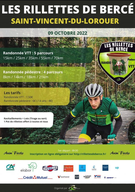Saint-Vincent LBC organise le dimanche 9 octobre à Saint-Vincent-du-Lorouër les Rillettes de Bercé, randonnée VTT et pédestre. 5 parcours : 70km (1100m D+), 55km (900m), 35km (600m) et 25km (300m), 15km.