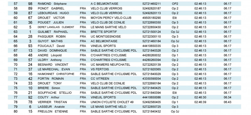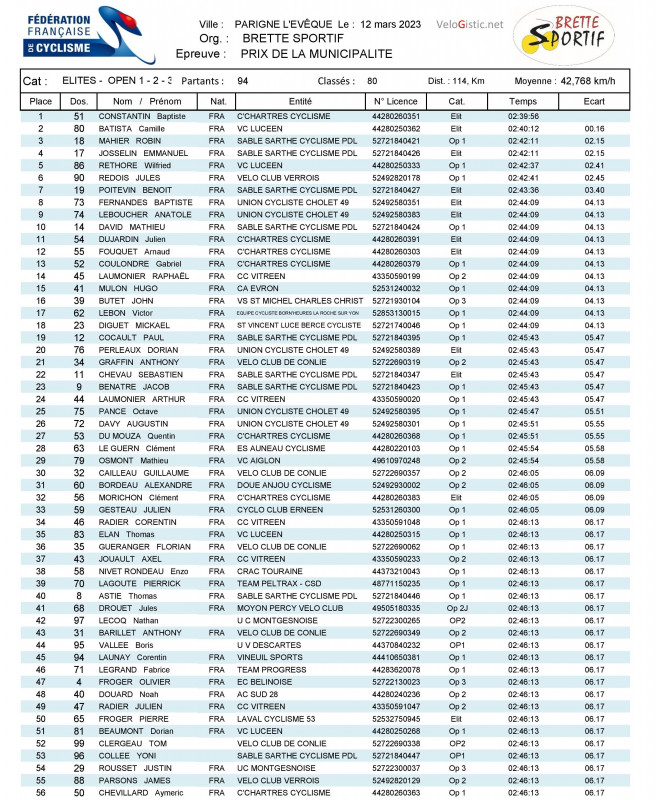 Baptiste Constantin (C'Chartes Cyclisme) a remporté ce dimanche le GP de Parigné-l'Evêque (Elite+Open) organisé par Brette Sportif. Le podium est complété par Camilla Batista (VC Lucéen) et l'espoir Robin Mahier (Sablé Sarthe Cyclisme PDL).