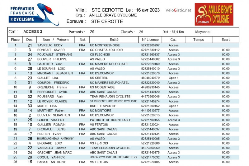 Sainte-Cérotte - U15/U17 - Access - dimanche 16 avril - victoires de Nolan Cabaret (VSF), Paul Becchio (ASCE), Antoine Ledru (ACB), Eddy Savreux (UCM) et Cyril Belliard (ASB)