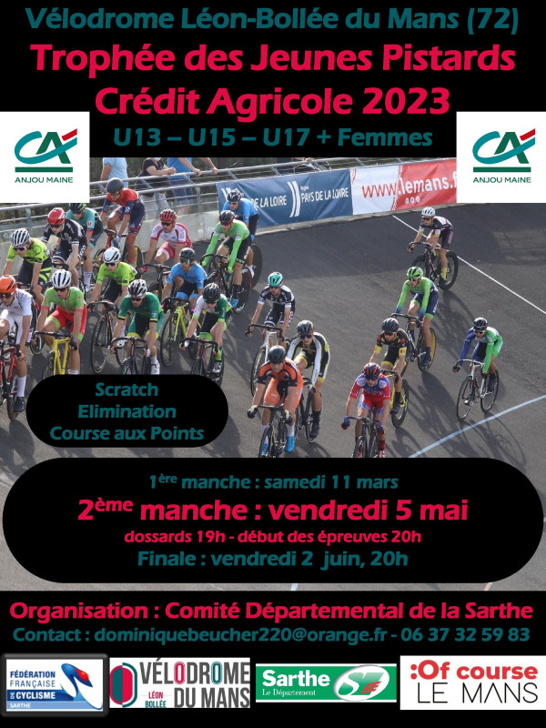 Après l'annulation de la 1ère manche en raison des conditions météorologiques, le comité départemental organise le vendredi 5 mai la 2ème manche du Trophée des Jeunes Pistards Crédit Agricole. Les épreuves sont ouvertes aux U13-U15-U17 + Femmes toutes catégories. Au programme de cette 1ère manche : Scratch, Elimination et Course aux Points.