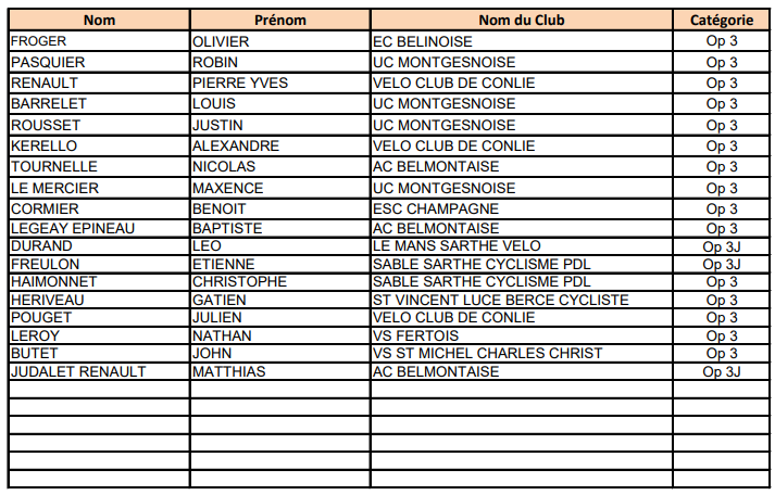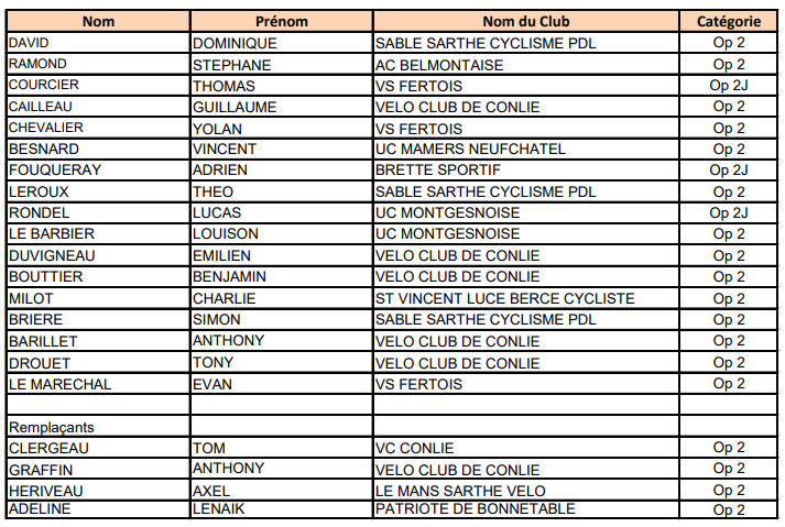 Retrouvez ci-dessous les sélectionnés Sarthois pour le championnat régional Open 2 et Open 3 qui aura lieu le lundi 8 mai à Morannes dans le Maine-et-Loire.