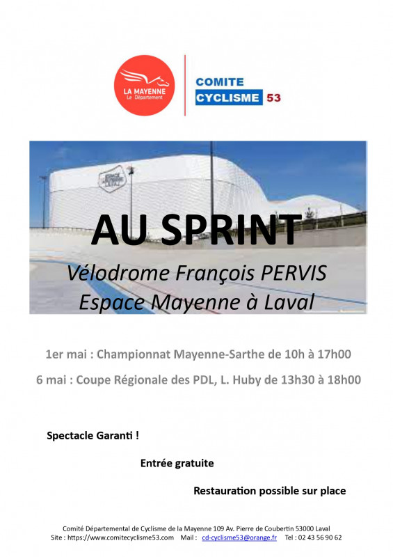 Le comité départemental de la Mayenne organise sur le vélodrome François Pervis de Laval lundi 1er mai les championnats bi-départementaux Sarthe/Mayenne sur piste et samedi 6 mai la 2ème manche de la Coupe des Pays-de-la-Loire Louis Huby.