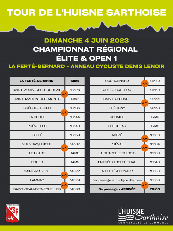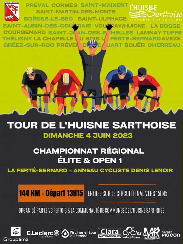 Le VS Fertois organise le dimanche 4 juin autour de la Ferté-Bernard le Tour de l'Huisne Sarthoise qui sera le Championnat régional Elite + Open 1. Au programme 101km en ligne à travers les communes de la comunauté de communes de l'Huisne Sarthoise puis 5 tours de 8,5km soit 143,5km.