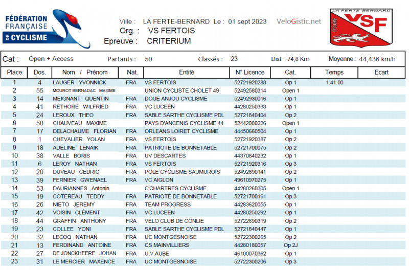 Yvonnick Lauger a remporté ce vendredi soir le critérium de la Ferté-Bernard organisé par son club, le VS Fertois. Il a devancé au sprint Maxime Mourot Bernadac (UC Cholet 49) et Quentin Meignant (Doué Anjou Cyclisme).