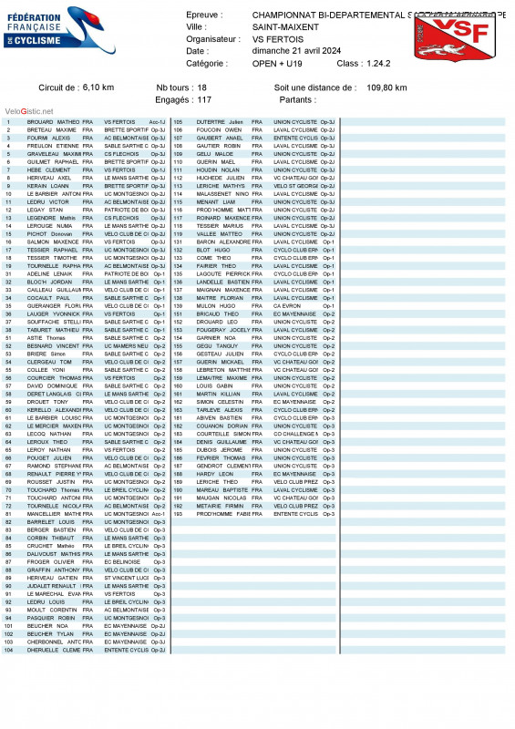 Le VS Fertois organise le dimanche 21 avril le championnat bi-départemental Sarthe-Mayenne Open + U19 (Open/Access). Au programme 18 tours de 6,1km soit 109,8 km.