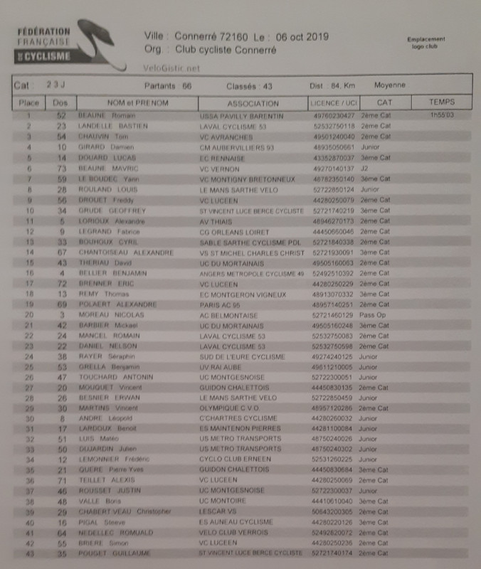 Romain Beaune (USSA Pavilly Barentin) a remporté ce dimanche en attente de Paris-Connerré le Prix Narcisse Hériveau (2-3+J) organisé par le CC Connerréen. Le Normand a devancé au sprint en haut de la rue de Paris Bastien Landelle (Laval Cyclisme 53) et Tom Chauvin (VC Avranches). Le vainqueur de l'édition 2018 Damien Girard (CM Aubervilliers 93) est 4ème et 1er junior, Lucas Douard (EC Rennaise) est 5ème et 1er 3ème catégorie et Nicolas Moreau (AC Belmontaise) est 20ème et 1er pass'cyclisme.